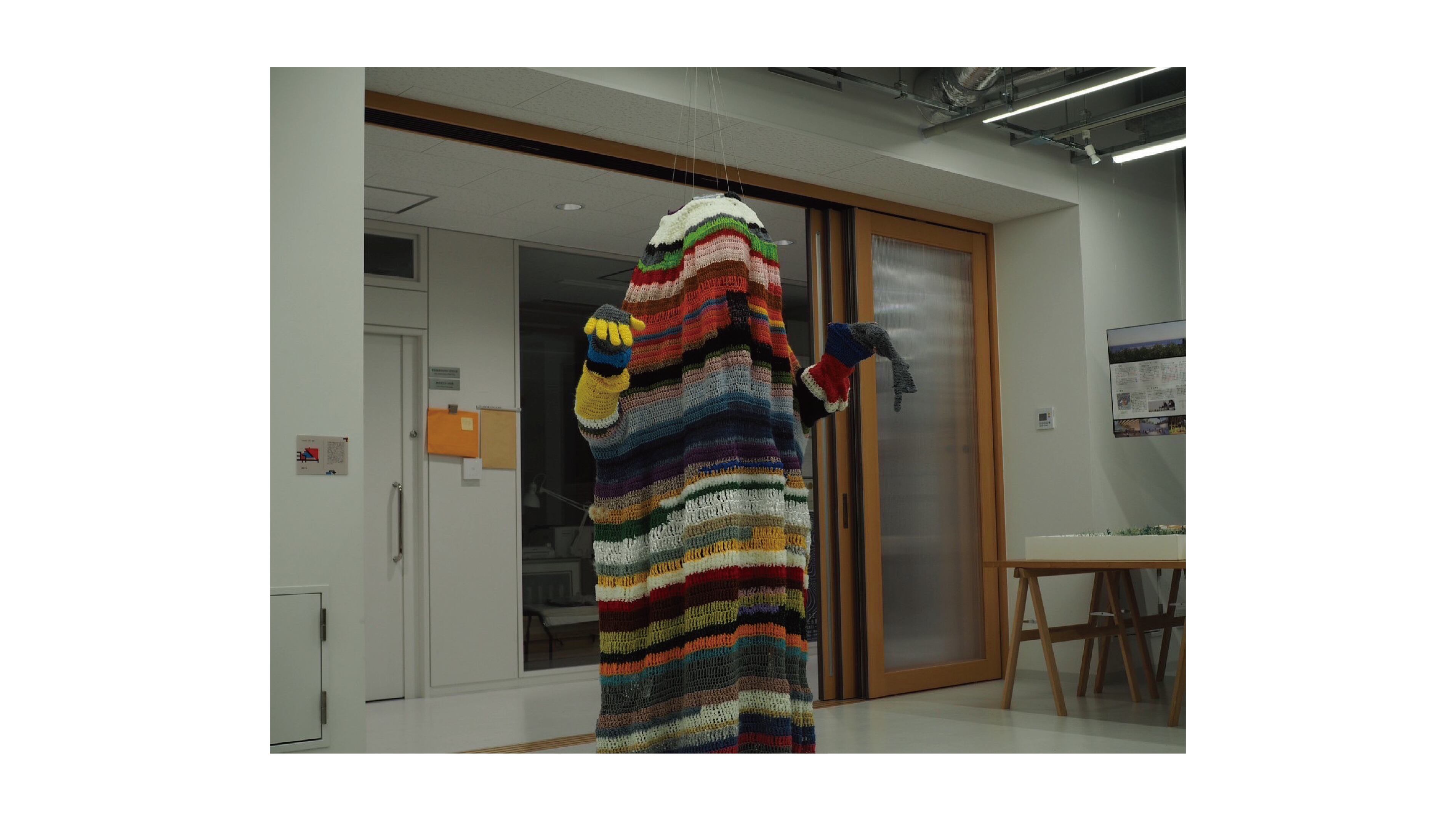 手編みという手法は、編むそれぞれの場所や瞬間の私の心情、自覚していない潜在意識が現れるもので、念として作品に宿る。その蓄積として賑やかな外側がある一方で、内側は静かであたたかみのある小さな空間がある。中に入って一人きりで作品と向き合い、袖に手を通したり、生き物のようにゆらゆら動かすことは、作品に対する念を生み出すことでもあり、自身を作品に投射する感情移入につながる。またその中で生まれた感情や行動を拾い上げ、向き合うことができれば、この作品は私の祈りを含んだ自己理解を促すものとして完成し、存在できると考える。